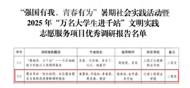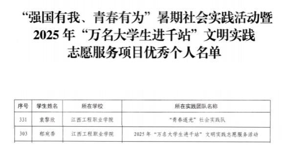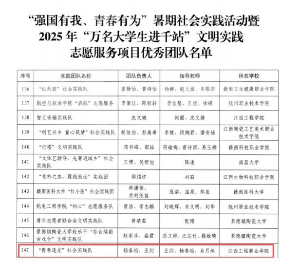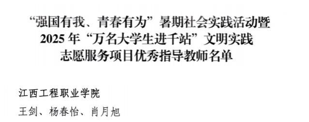 在省委宣传部、省文明办、省委教育工委、团省委联合开展的“强国有我、青春有为”暑期社会实践活动暨2025年“万名大学生进千站”文明实践志愿服务项目评选中,学校师生踔厉奋发、表现优秀,斩获佳绩!