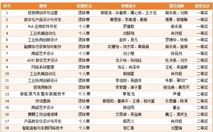 本届大赛覆盖多个专业领域,竞争激烈。学校参赛选手在短视频创作与运营、数字化产品设计与开发、Web应用软件开发、工业机械自动化、工业协同创新设计、融媒体内容策划与制作、陶瓷艺术设计等7个高含金量赛项中表现突出,斩获一等奖,充分体现了学校在相关专业建设上的综合实力,彰显了学校落实立德树人根本任务、服务产业发展需求的育人实效。
