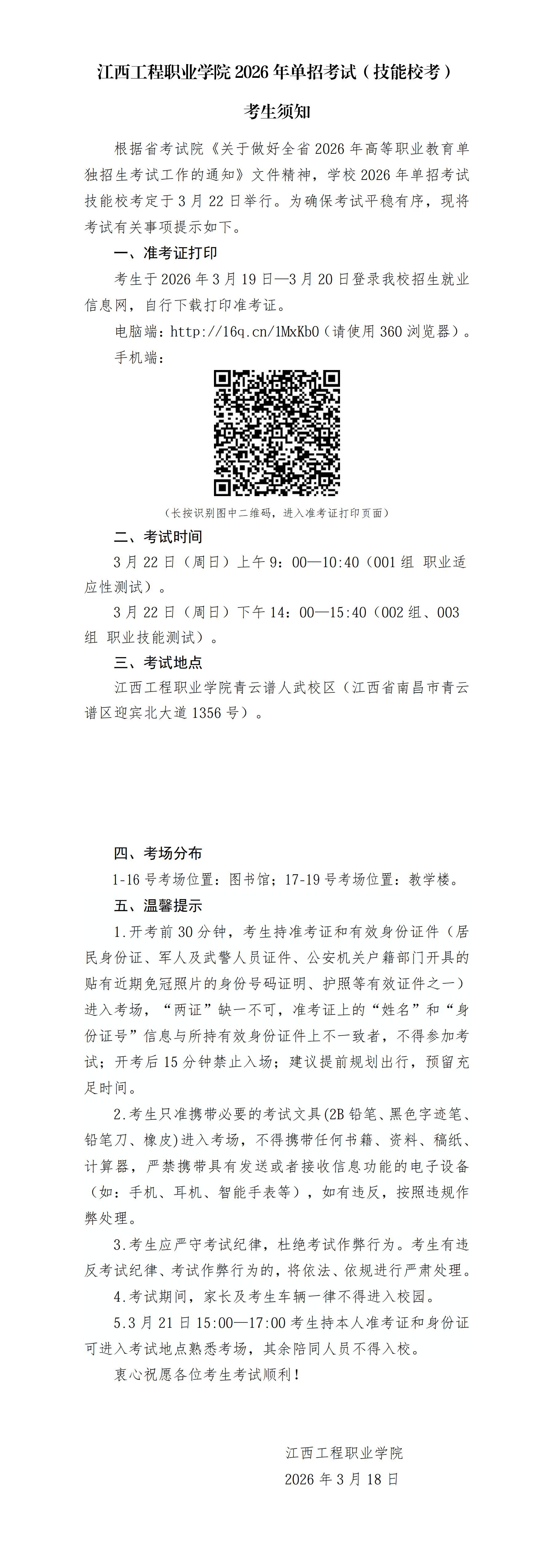 江西工程职业学院2026年单招考试(技能校考)考生须知